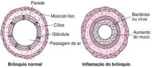 Na bronquite, áreas das paredes dos brônquios ficam inflamadas e inchadas, aumentando a produção de muco. Como resultado, ocorre estreitamento da passagem de ar.